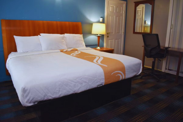 The 1 King Room offers a range of amenities to ensure a comfortable stay. This room features air conditioning, a private bathroom with a shower, satellite TV, and an iron and ironing board. Guests can enjoy free WiFi, daily housekeeping, a complimentary breakfast, and free self-parking. The room is accessible via exterior corridors and includes a partially open bathroom with towels provided. For entertainment, there's a 35-inch TV with satellite channels and free wired internet. The bedroom is equipped with air conditioning and bed sheets. This room is perfect for up to two adults, providing a cozy and convenient retreat.