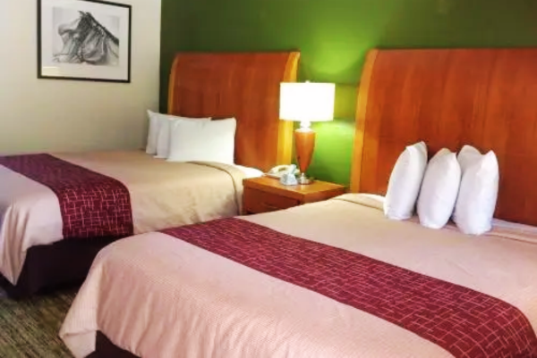 The 2 Queen Room offers a range of amenities designed for a comfortable stay. This room includes air conditioning, a private bathroom with a shower, satellite TV, and an iron and ironing board. Guests can enjoy free WiFi, daily housekeeping, complimentary breakfast, and free self-parking. The room is accessible via exterior corridors and features a partially open bathroom with towels provided. For entertainment, there's a 35-inch TV with satellite channels and free wired internet. The bedroom is equipped with air conditioning and bed sheets. This room accommodates up to four adults, providing ample space and comfort for your stay.